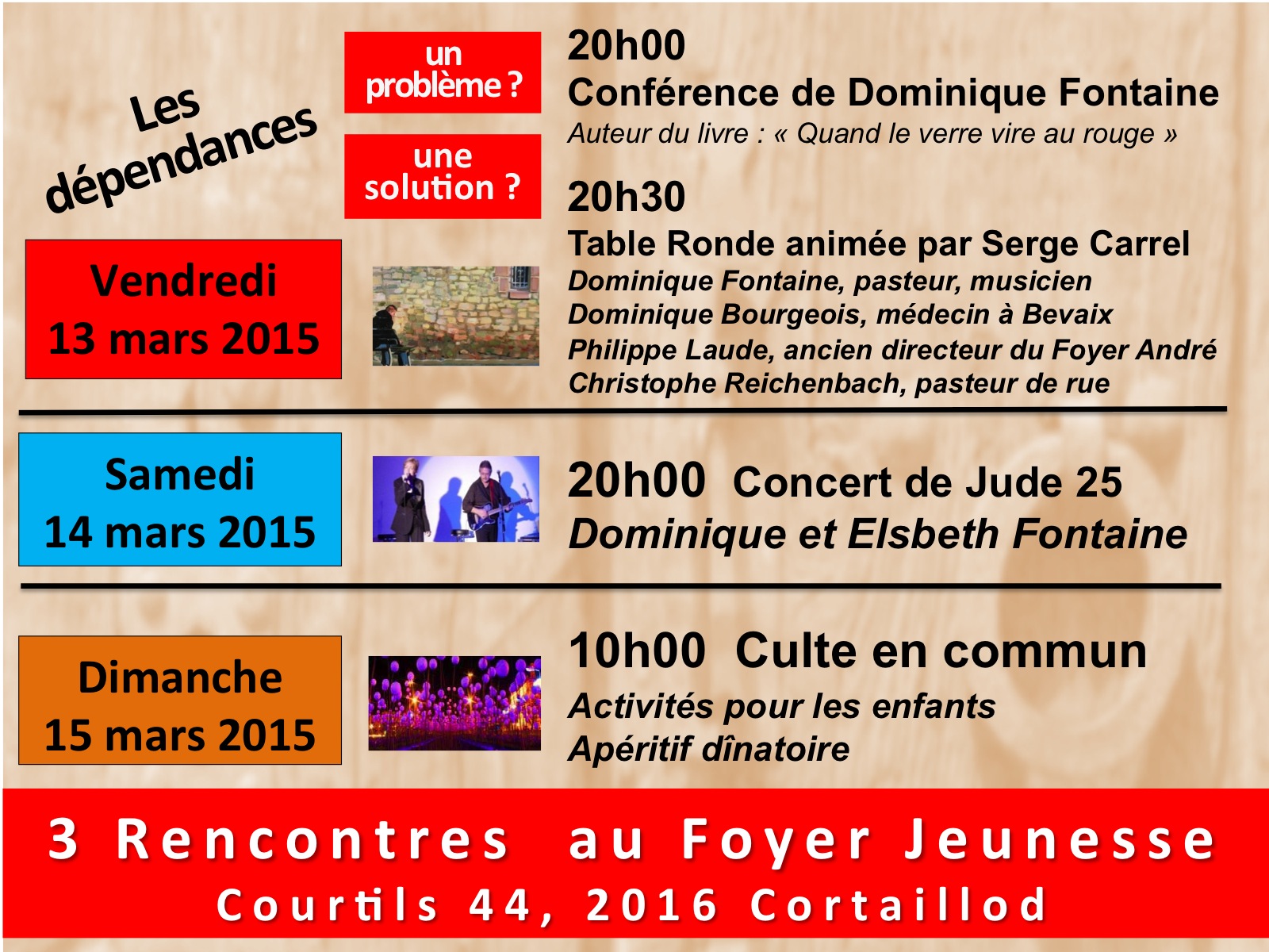 Cette rencontre sur les dépendances s’inscrit dans une série de trois. Le samedi 14 mars, Dominique Fontaine et son épouse Elsbeth donneront un concert dans le cadre du groupe de musique Jude 25. Le dimanche 15, un culte en commun permettra aux personnes intéressées et aux quatre Eglises évangéliques organisatrices de se retrouver pour un temps de célébration. (c)