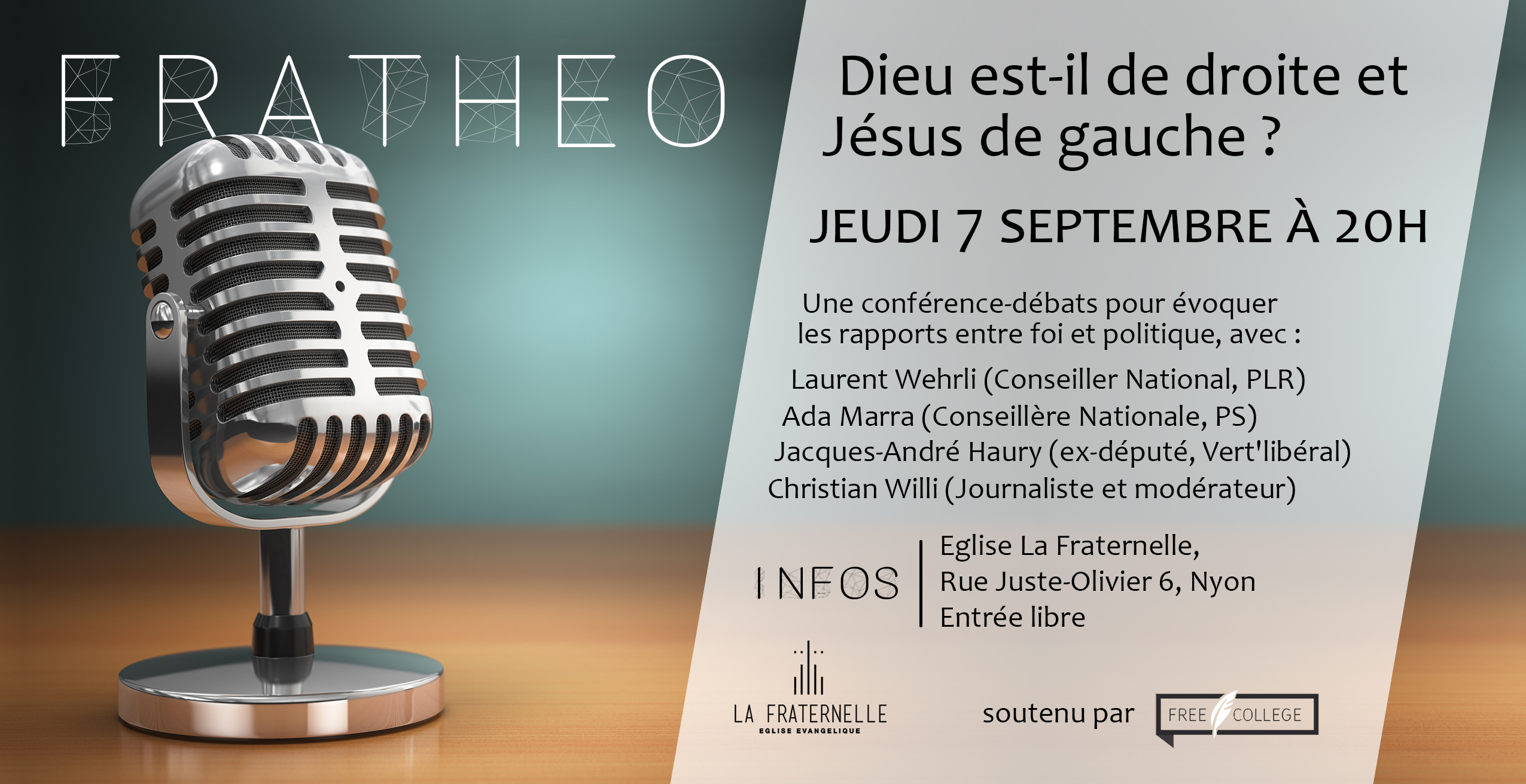 Le jeudi 7 septembre, l’Eglise évangélique La Fraternelle à Nyon (FREE) organise une soirée Frathéo : « Foi et politique » avec les conseillers nationaux Ada Marra et Laurent Wehrli, ainsi qu’avec l’ancien député vaudois Jacques-André Haury. L’occasion de s’interroger si Dieu est de droite et Jésus de gauche !