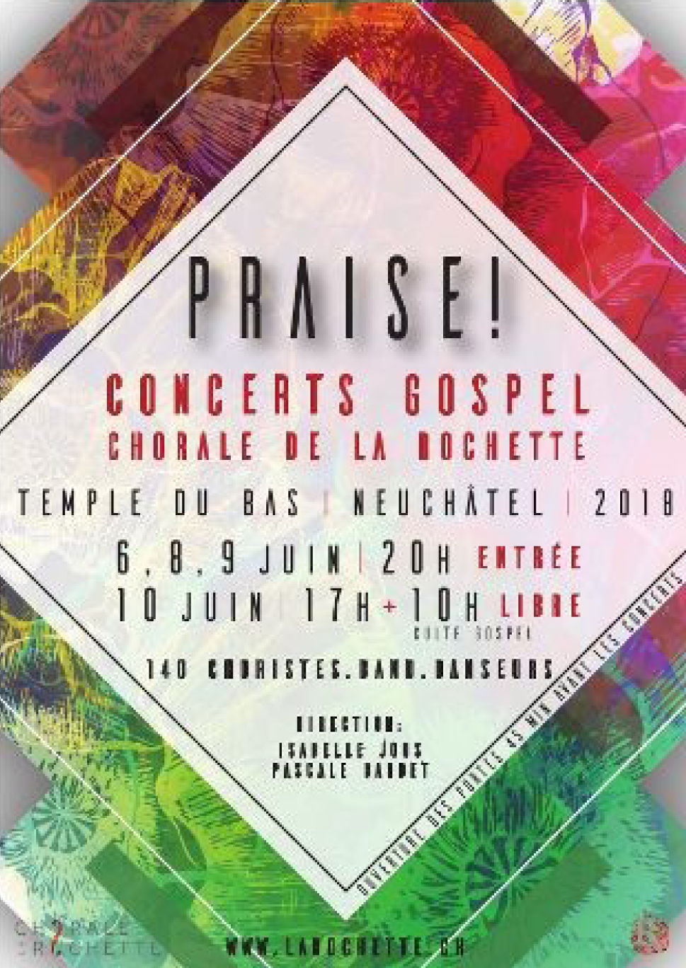 Du 6 au 10 juin, la chorale Gospel de l’Eglise évangélique de la Rochette (FREE), à Neuchâtel, propose une série de concerts au Temple du Bas. Dix-huit chants de styles variés sont interprétés par 140 choristes de 15 à 82 ans. Ceux-ci viennent du canton de Neuchâtel, mais aussi des cantons de Vaud, Fribourg et Berne. Ils sont accompagnés de trois solistes, de musiciens et de danseurs. Quant à la direction, elle est assurée à quatre mains. Isabelle Joos et Pascale Bardet, les deux directrices qui ont œuvré séparément par le passé, travaillent ensemble cette année.